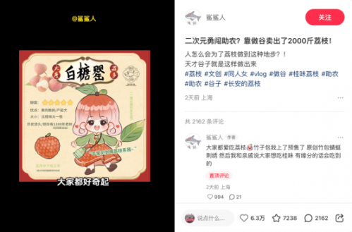 火爆的交流种草,自然带动不少社区用户主动求购「不泡水」「高品质」的荔枝,牵引出一批优质荔枝供给商。有农户靠一篇笔记卖出5万单,更有年轻人用「谷子风」创意设计帮助爷爷卖出荔枝两千斤。